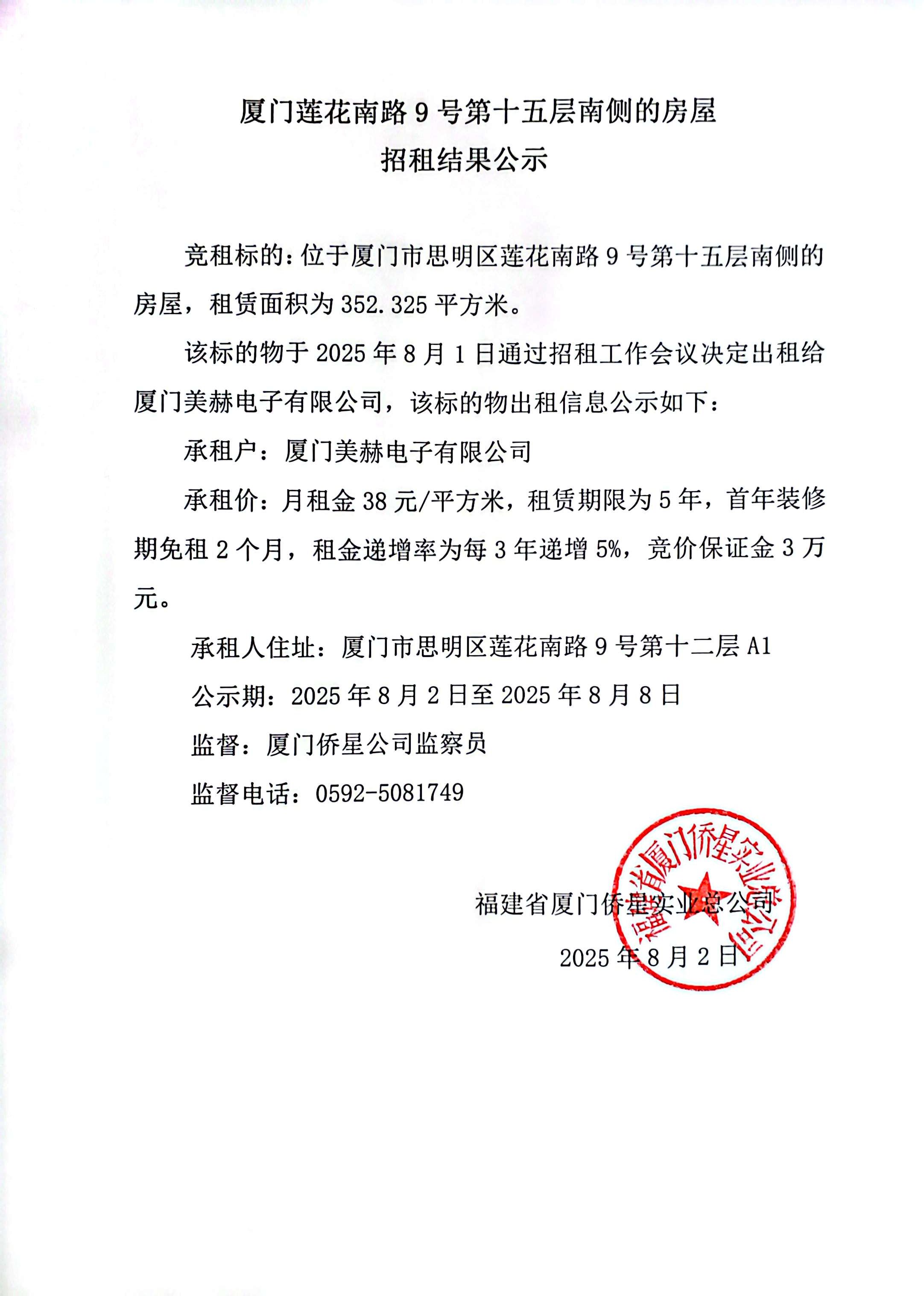 廈門蓮花南路9號(hào)第十五層南側(cè)的房屋招租結(jié)果公示